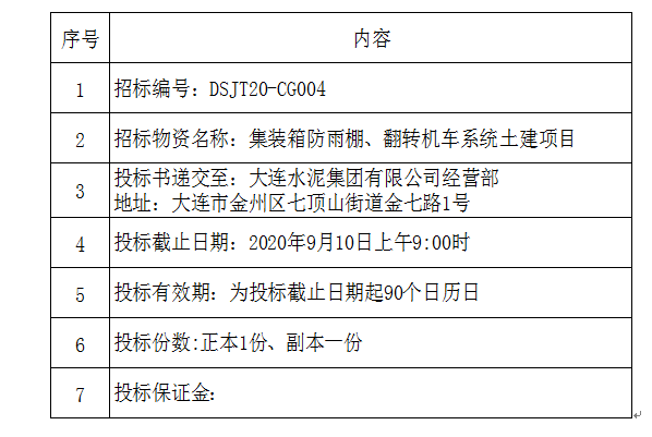 2.項(xiàng)目說明:大連水泥集團(tuán)有限公司組織對(duì)大連水泥廠2#鋼倉北側(cè)新建兩條水泥集裝箱系統(tǒng)防雨棚、2#鋼倉北側(cè)水泥集裝箱翻轉(zhuǎn)機(jī)裝車系統(tǒng)土建、3#、4#庫側(cè)水泥集裝箱防雨棚項(xiàng)目項(xiàng)目進(jìn)行邀請(qǐng)招標(biāo)。凡接到本招標(biāo)邀請(qǐng)的廠商均可參加投標(biāo)。
